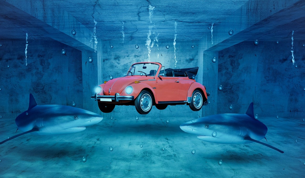 상어와 물고기 떼가 헤엄치고 있는 꿈은 길몽으로 큰 재물이 들어오고 횡재수가 있다는 의미입니다.
